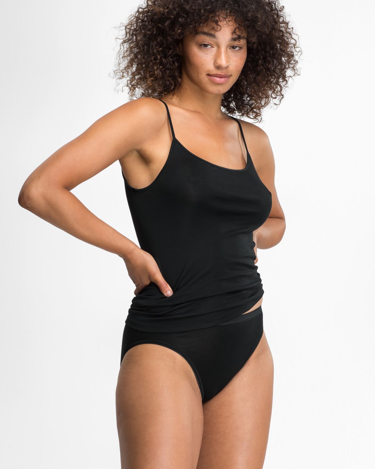 Trägerhemd in schwarz aus der Serie Nadine, flach auf einer Oberfläche liegend.