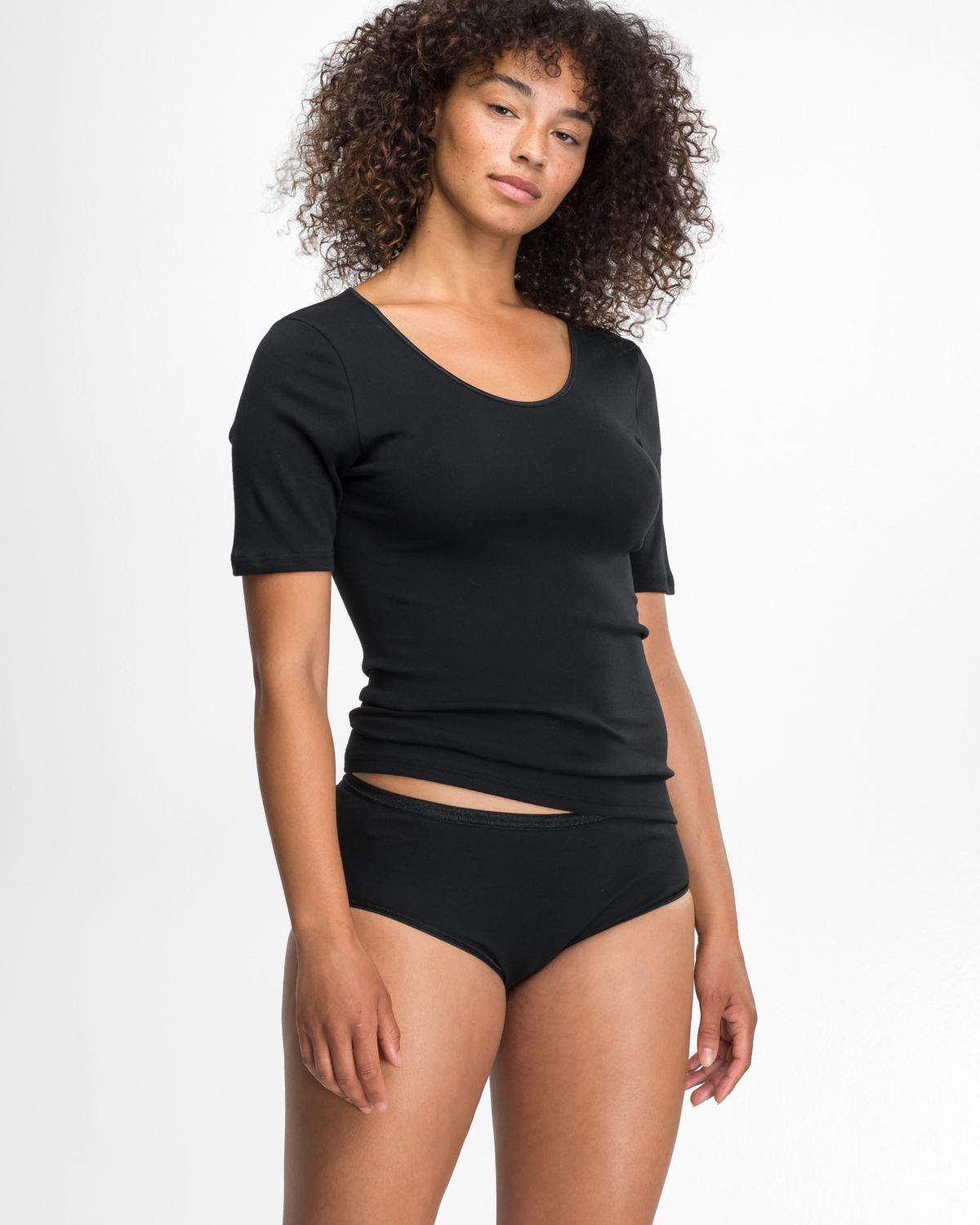 Shirt 1/4 Arm in schwarz aus der Serie Sanja, flach auf einer Oberfläche liegend.