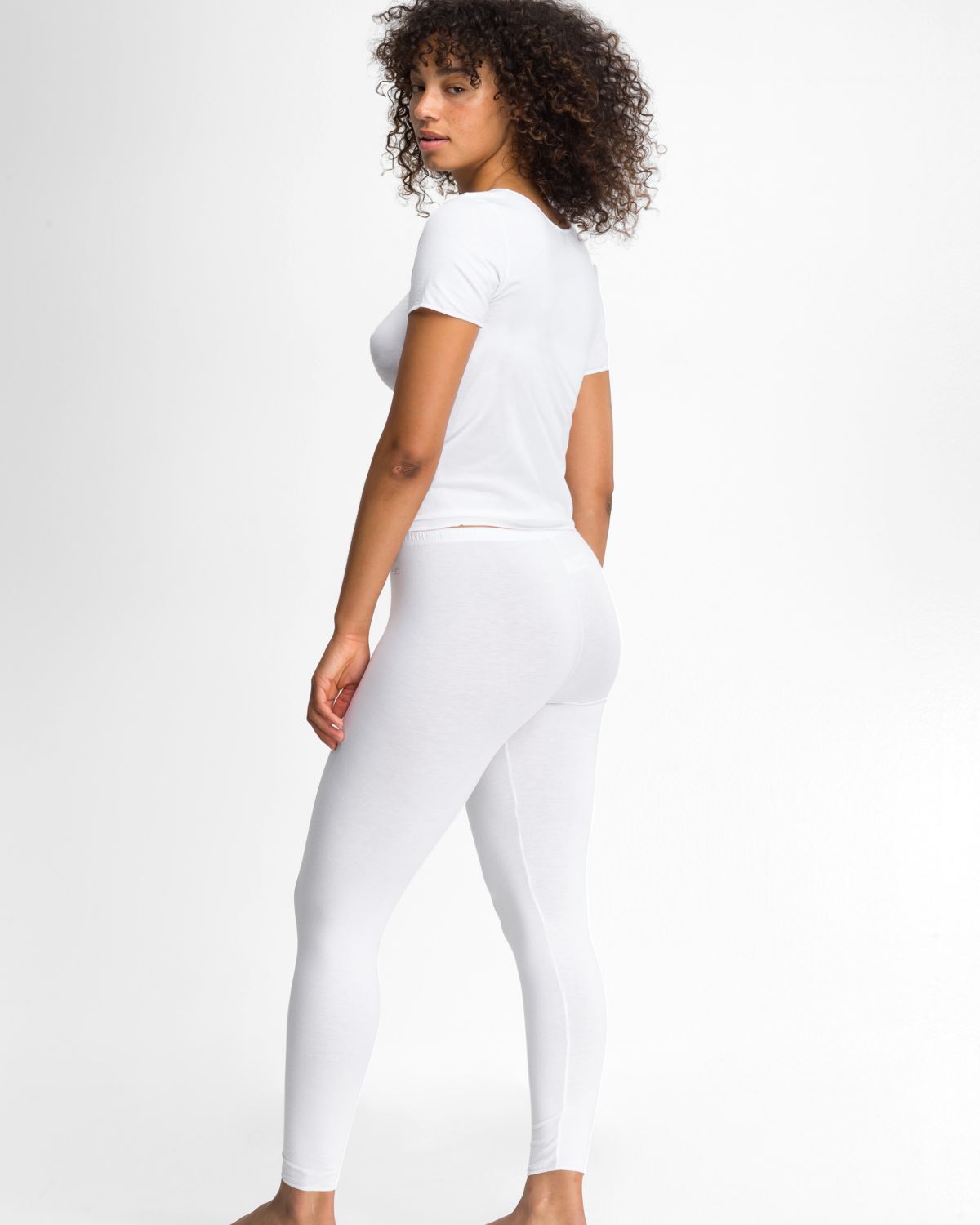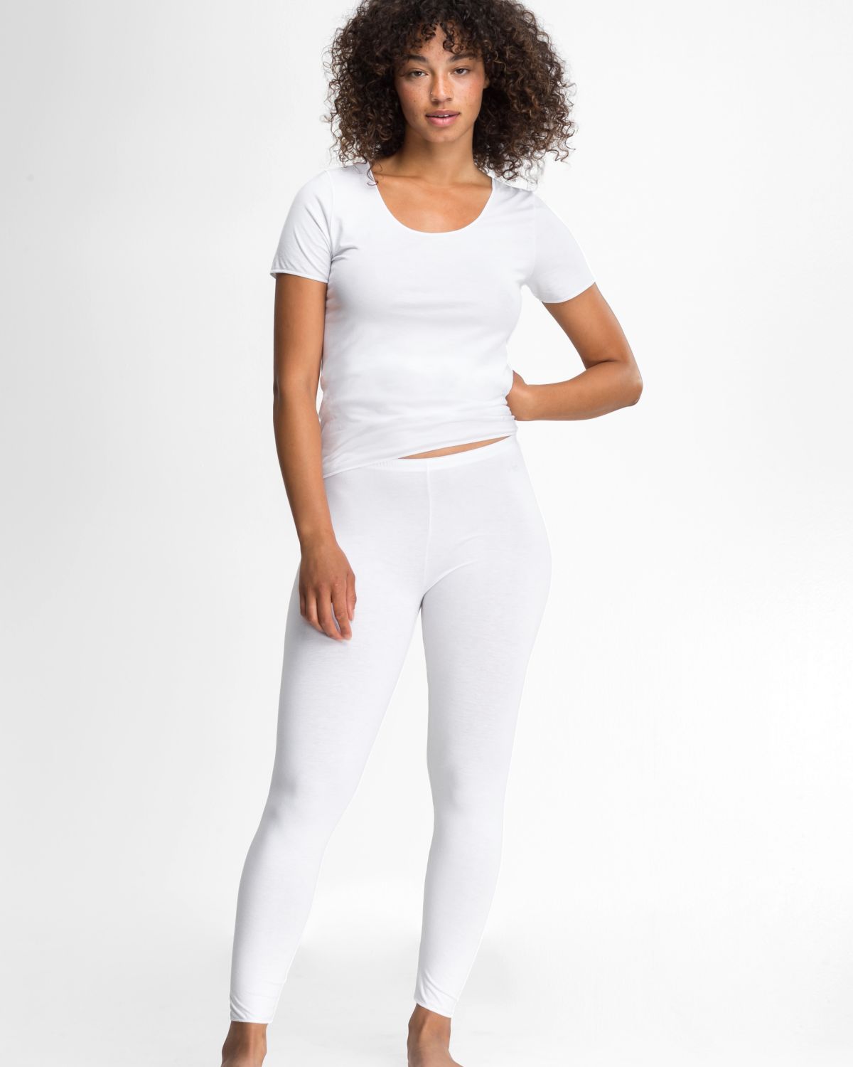 Lange Hose in weiß aus der Serie Y-loft, flach auf einer Oberfläche liegend.