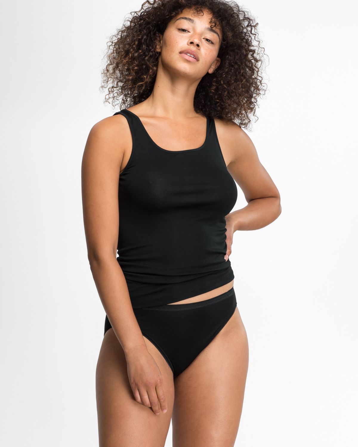 Trägerhemd in schwarz aus der Serie Nadine, flach auf einer Oberfläche liegend.