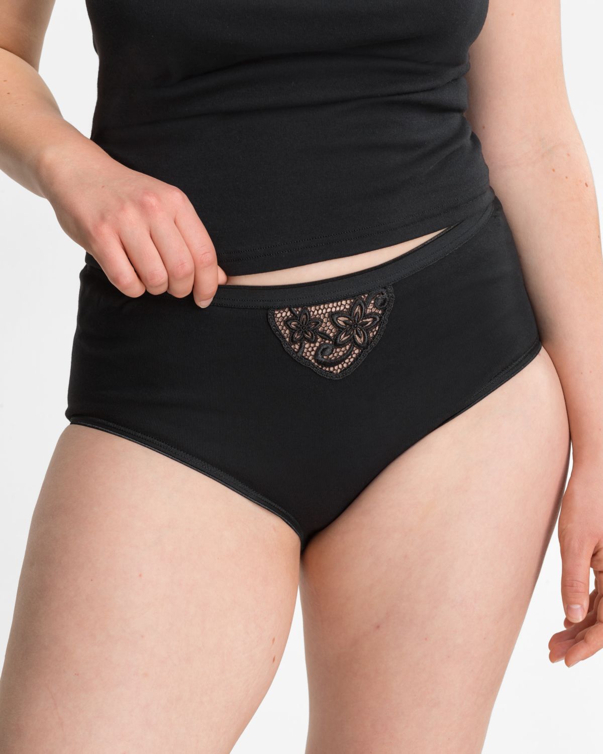 Unser Maxislip mit charmantem Spitzenmotiv spricht Frauen mit femininen Kurven an und überzeugt mit 100% Baumwolle.
