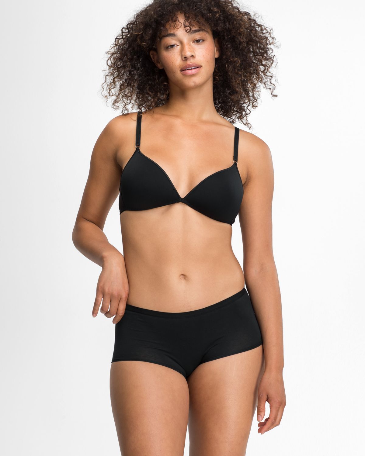 Minislip in schwarz aus der Serie Take two, flach auf einer Oberfläche liegend.