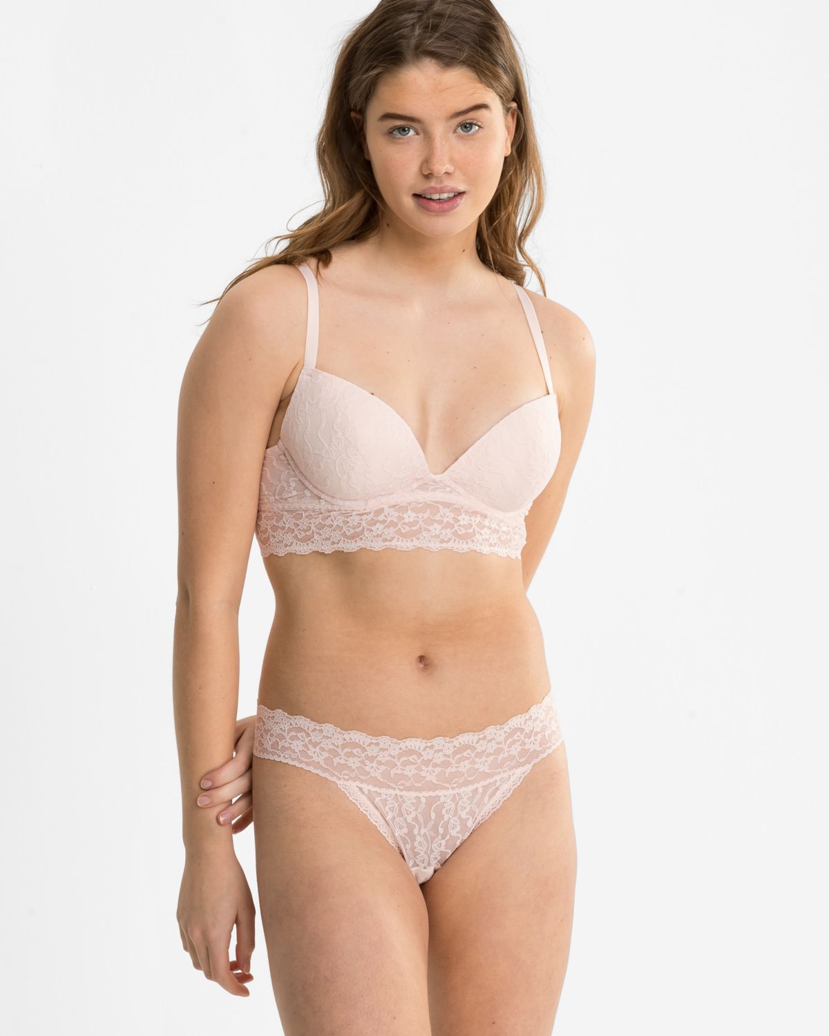 Bralette in lychee aus der Serie Lacy, flach auf einer Oberfläche liegend.